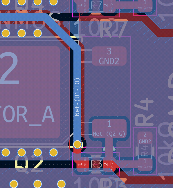 A相の配線はビアで裏面のベタを通してXT30までつなげてたのですが、ベタの後に通したゲートの配線が横切ってて1mmも無いくらい細くてパターンが焼ききれてました